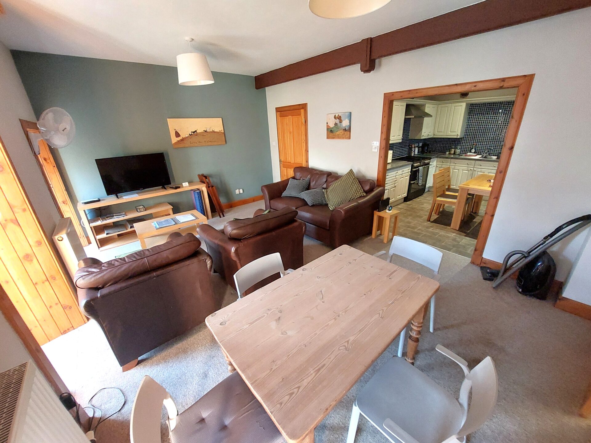There is a large well-equipped kitchen/diner with a table/seating for 4 to 6 , range cooker, fridge/freezer, dishwasher and microwave.